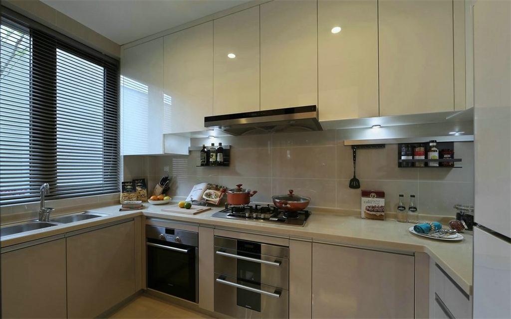 廚房里光滑的米白色櫥柜與黑色的窗體,