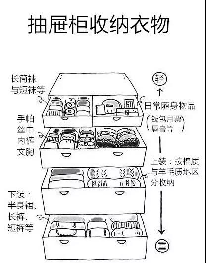 ! 注意事項 如果衣柜被放在了與床相對的墻邊,那么兩件家具之間的距離應大于900mm,不然開門不方便。但大衣柜若采用推拉門則不存在這個問題,距離可視情況而定。 解決了衣柜的合理設計,小勝無私貢獻出珍藏的一套萌萌噠衣物收納手繪圖,上衣褲子裙子怎么折疊,襪子怎么卷,內衣怎么收納,尤其是家里衣櫥沒有那么多可以懸掛的空間來說,聽起來就感覺棒棒噠是不是?趕緊戳圖收藏吧!題
